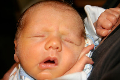 Jack came very quickly and very easily at the end, a wee little thing, he popped right out into Daddy's hands! Erik says he gets more emotional each time! And, this little man had a knot in his cord. My doctor called it a "true knot" whatever that means! It is a scary sight to see ~ your cord all tangled like that. After a few moments, Erik put Jack on my chest, and I fell in love again. :-) Then they took that sweet vernix covered love of mine and cleaned him, wrapped him, and gave him back to me to love. He smelled that freshly born scent that I love. He was a sweet little bundle, and I held him close. Sweet Jack here with us 5 weeks early, our biggest surprise yet and born on April Fools Day, too!!!
